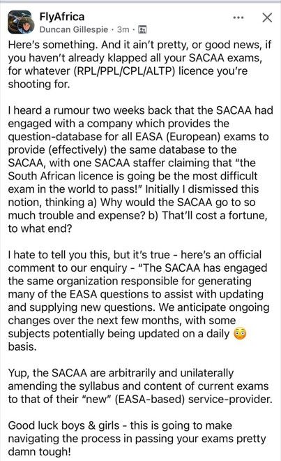 Johannesburg, South Africa: In a time when misinformation spreads faster than the speed of sound, the South African Civil Aviation Authority (SACAA) has once again demonstrated the importance of regulatory integrity and factual accuracy. A recent post in the closed Facebook group, Fly Africa, attempted to incite unwarranted panic within the aviation community by falsely claiming that SACAA was in the process of unilaterally overhauling the entire aviation training syllabus—from Private Pilot Licence (PPL) to Airline Transport Pilot Licence (ATPL)—in favour of a European Union Aviation Safety Agency (EASA)-styled curriculum. According to the post, this change would make South African pilot training one of the most expensive and complex in the world, effectively limiting access and progression in the industry.
