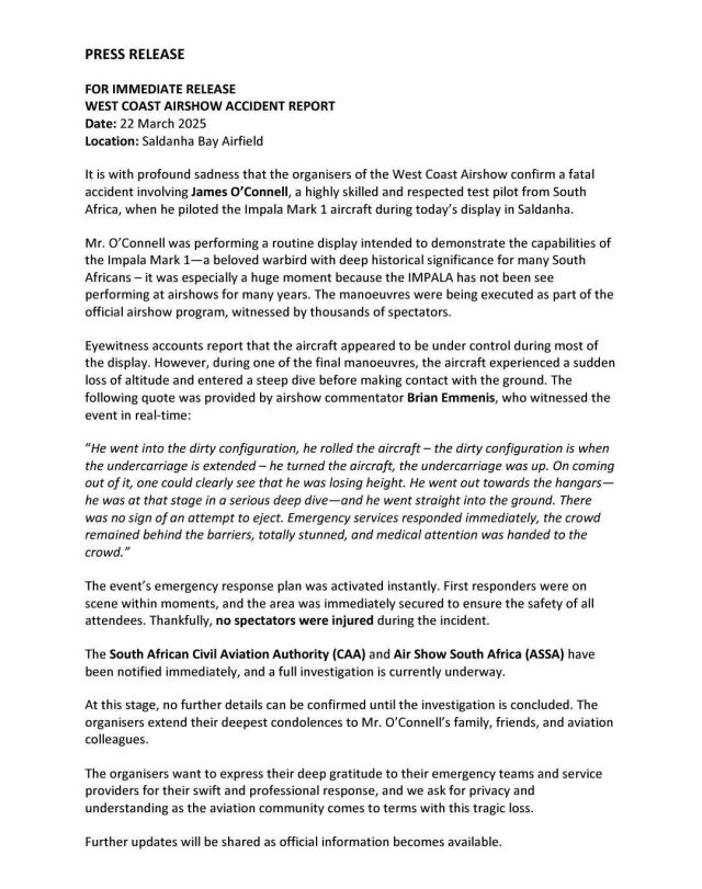 Saldanha Bay, South Africa: On 22 March 2025, at the West Coast Airshow in Saldanha, in the Western Cape Province of South Africa, our aviation community was struck by a profound tragedy. James O’Connell, a renowned and highly skilled pilot, tragically lost his life while demonstrating the capabilities of the Impala Mark 1, registration ZU-IMP—an aircraft cherished for its historical significance among many South Africans.